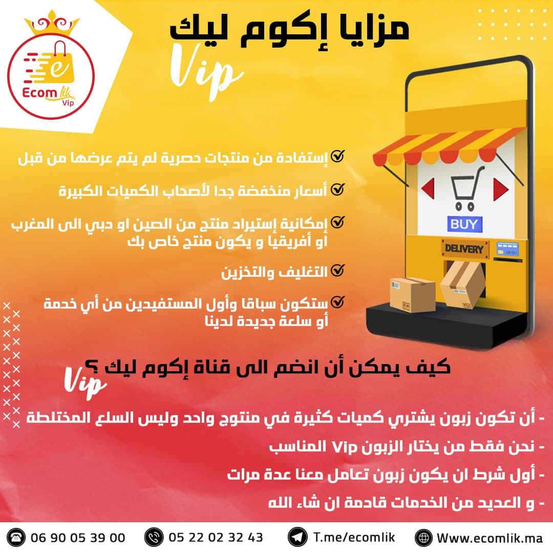 تسوق آمن، خيارات دفع متعددة، شحن سريع. http://ecomlik.ma/ هي منصة تسوق رائدة محلياً و إفريقيا. نحن نسعى إلى نقل تجربة التسوق بالجملة عبر الإنترنت إلى مستوى أكثر جاذبية